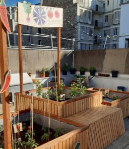 Toit terrasse Eglantine et CHRS : verger, ateliers inclusifs pour résidents et salariés.